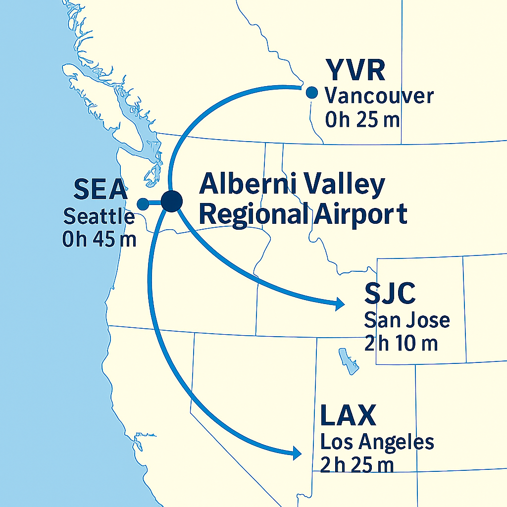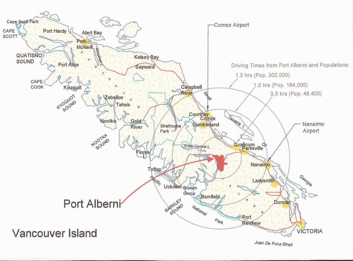 The Alberni Valley Regional Airport (CBS8) can handle 737 type-chartered flights which is easily connected to major U.S. host cities – e.g., Seattle (in 45 minutes), San Francisco (in 2 hours 10 minutes, Los Angeles (in 2 hours 25 minutes). Team can also fly to other US destination, Mexico and Toronto via Chartered flight from Port Alberni. Most venues are within 5 hours flying time from Port Alberni.